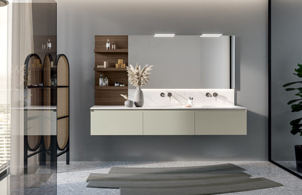 Il bagno Camelia nasce per rispondere al bisogno crescente di avere un ambiente bagno che non sia solo funzionale, ma anche accogliente, ordinato e altamente personalizzabile.